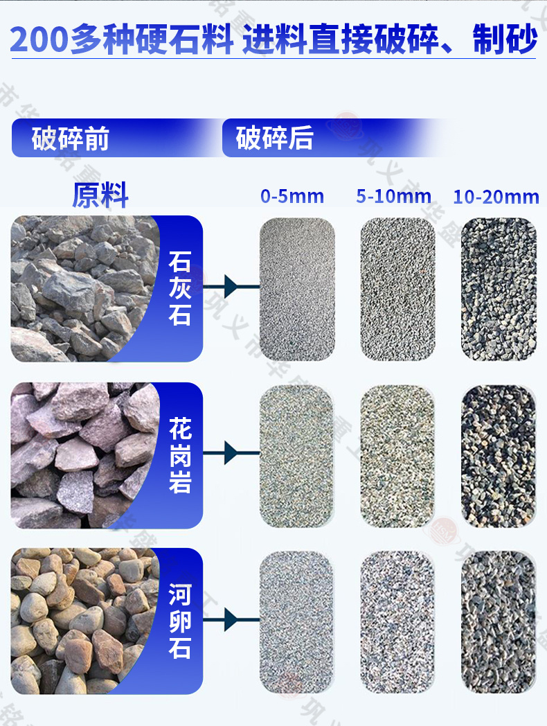 河卵石、方解石、石英、玻璃、大理石、鵝卵石、膨潤土、鐵礦石、青石、山石、石灰石、風(fēng)化砂、輝綠巖、花崗巖、玄武巖等物料的破碎制砂工作。